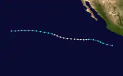 Late on August 23, an area of disturbed weather developed about 485 miles (781 km) south of Acapulco, Guerrero.[2] It rapidly coalesced into a tropical depression around 00:00 UTC the next day, but only slowly strengthened into Tropical Storm Iva by 18:00 UTC on August 25.[3] The system moved west and then west-northwest, further developing into a hurricane by 18:00 UTC on August 26 as a small eye became distinct.[2] Iva attained major hurricane strength late on August 27, further intensifying to its peak as a Category 4 hurricane with winds of 130 mph (210 km/h) around 06:00 UTC the following morning.[3] It oscillated in strength over the subsequent 24 hours, but ultimately began a steady weakening trend by August 30 while passing over marginal ocean temperatures.[2] Iva fell to tropical storm strength early that day, weakened to a tropical depression early on September 1, and dissipated around 00:00 UTC on September 2.[3]