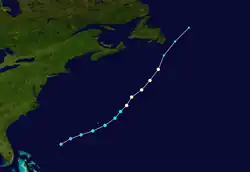 A tropical depression formed between the Greater Antilles and Bermuda on November 3. Initially, the depression moved northeastward, though on November 4, a building high pressure area forced it to track north of due west. Eventually, an upper-level low situated over the Southern United States caused the depression to re-curve north-northwestward. Late on November 7, the depression made landfall near Cape Lookout, North Carolina. By early on the following day, the depression degenerated into a low pressure area while located over eastern Virginia. The remnants continued northeastward across the Mid-Atlantic and New England, before being absorbed by an extratropical cyclone while offshore of Maine on November 11.[25]
