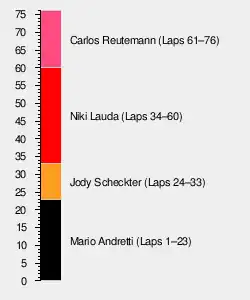 Reutemann closed up to Lauda and passed him for the lead on lap 60, as the two were lapping the McLaren of Bruno Giacomelli. The Argentine held off the Austrian for the remaining laps, eventually taking his third win of the season by 1.2 seconds. Watson finished 36 seconds behind Lauda and 36 ahead of Depailler, while a suspension failure for Rosberg on lap 60 meant that the final points went to Hans-Joachim Stuck in the Shadow and Patrick Tambay in the McLaren.