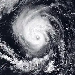 An area of disturbed weather within the ITCZ developed into Tropical Storm Susan around 00:00 UTC on October 18.[7] The storm intensified over subsequent days, becoming a hurricane around 00:00 UTC on October 20 and further developing into a major hurricane by 18:00 UTC the next day. Susan attained Category 4 strength with winds of 130 mph (210 km/h) six hours later,[6] one of the strongest on record in the Central Pacific at that time. Although the powerful hurricane initially tracked northwest toward Hawaii, it sharply veered toward the southwest while succumbing to strong wind shear.[7] Susan weakened rapidly, with winds falling from 115 to 35 mph (185 to 56 km/h) within 24 hours, and dissipated after 00:00 UTC on October 24.[6]