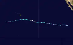 A tropical disturbance, first identified in association with a tropical wave west of Nicaragua on June 24,[4][5] moved west-northwest and organized into a tropical depression by 18:00 UTC on June 26.[6] It intensified into Tropical Storm Daniel within twelve hours but weakened to a tropical depression again while tracking over 26 °C (79 °F) ocean waters. After moving into warmer waters again,[5] Daniel regained tropical storm strength before 18:00 UTC on June 28 and intensified into a hurricane 24 hours later. Around 12:00 UTC on June 30, the hurricane attained major hurricane strength with winds of 115 mph (185 km/h).[6] The cyclone tracked west and then west-southwest over steadily cooler waters,[5] which resulted in its weakening and degeneration to a disturbance after 18:00 UTC on July 3.[6] The remnant system moved across the Central Pacific and through the Hawaiian Islands, where it lost definition on July 11.[7]