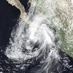Tropical Storm Paul, the second system alongside Hurricane John without any genesis ties to the Atlantic,[4] was first identified north of Hurricane Olivia on September 22.[5] The system developed into a tropical depression by 00:00 UTC on September 23 but failed to intensify for several days thereafter. Finally, by 12:00 UTC on September 25, the system organized into Tropical Storm Paul.[6] It attained peak winds of 45 mph (72 km/h) six hours later as it curved toward the northeast, narrowly missing Baja California Sur.[5] Paul began to weaken as it approached the Mexico coastline, which it struck as a tropical depression around 12:00 UTC on September 26.[5] Six hours later, the depression transitioned into an extratropical cyclone,[6] which only persisted for an additional six hours before dissipating over northern Mexico.[5]