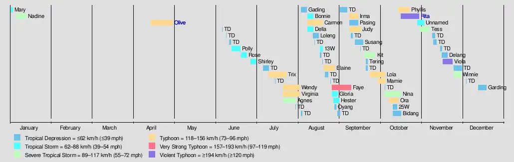 | Rita (Kading) | October 17 – 30 | Typhoon | 220 km/h (140 mph) | 880 hPa (25.98 inHg) | Caroline Islands, Mariana Islands, Philippines | $100 million | >300 | |