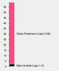 After one lap, Andretti had a four car-length lead over Reutemann and Villeneuve. They were followed by Jones, Lauda, Jarier, Hunt, Watson and Scheckter. Knowing the car had a brake problem, Andretti was hoping he could cope with it, as he had at Monza. Immediately, his lead began to disintegrate. On lap three, Reutemann went by, and on lap four, Villeneuve. As the Ferraris pulled away, Jarier came in on lap 11 from 11th place to change a deflating front tire. After going back out, the car was still bottoming, but once his fuel load lightened, he set the race's fastest lap, which would have qualified him third.
