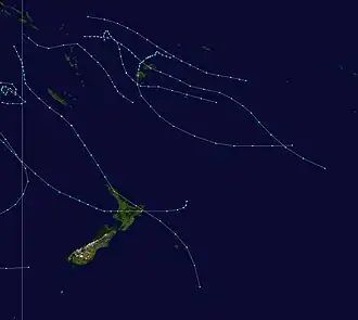 During January 9, the extratropical remnants of Tropical Cyclone Paul briefly moved into the region, before they moved back into the Australian region during the next day.[3][1] The remnants subsequently moved back into the region during January 12, when they were last noted to the south of New Zealand's South Island.[3] The precursor tropical depression to Severe Tropical Cyclone Simon, developed within the monsoon trough, to the northeast of New Caledonia during February 20.[1] Over the next day the system moved eastwards and into the Australian region, where it ultimately developed into a severe tropical cyclone and impacted Queensland.[3][1] During February 28, Simon's extratropical remnants moved back into the basin and impacted New Zealand, before they were last noted during March 3.[3][1]