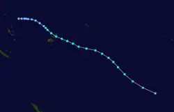 During the opening days of March 1980, a broad trough of low pressure, extended from Vanuatu to Queensland, Australia.[1] A tropical depression subsequently developed, along this trough during March 9, near Rennell Island in the Solomon Islands.[1][2] Over the next few days the system initially moved south-eastwards into the Australian region, as it gradually developed further before it turned south-westwards towards the South Pacific during March 10.[1] The Australian Bureau of Meteorology, subsequently reported that the depression, had developed into a tropical cyclone and named it Sina during March 11.[1] The system subsequently moved south-eastwards and back into the South Pacific basin, where it continued to intensify and move south-eastwards. During March 13, the system peaked as a Category 3 severe tropical cyclone with 10-minute sustained wind speeds estimated at 120 km/h (75 mph), as it passed about 200 km (125 mi) to the southwest of New Caledonia.[1][3] After the system had peaked, it accelerated south-eastwards while gradually weakened and transitioning into a cold cored low.[1][3] The system impacted northern New Zealand during March 15, before it was last noted during the following day.[1][3]