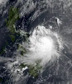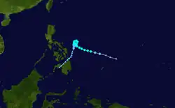 On 5 May, a weak tropical disturbance began developing in the near-equatorial trough. As it tracked westward across the Caroline Islands in the following three days, little development was seen.[8] Despite that, on May 7, the Japan Meteorological Agency designated the disturbance as a tropical depression.[7] The next day, an uptick in convective activity prompted the JTWC to issue a TCFA on the system, which was south of Guam. As the circulation steadily organized, the JTWC upgraded the system into a tropical depression.[8] Two days later, the depression crossed into the Philippine Area of Responsibility (PAR), causing the Philippine Atmospheric, Geophysical, and Astronomical Services Administration (PAGASA) to name it Ditang.[3] Despite intense vertical shear, the depression intensified into a tropical storm a few hours later, being named Dom by the JTWC.[8] After the wind shear relaxed, on May 11, the JTWC stated that Dom had intensified into a typhoon, with the JMA following suit the next day.[8][7] Soon after, Dom began weakening due to the mountainous terrain of Luzon, becoming a tropical storm on May 14. However, as Dom traced eastward, the next day, it re-intensified into a typhoon.[8]
