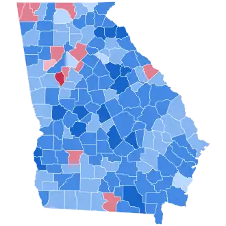 This was the last time in which the counties of McDuffie, Towns, Gilmer, Whitfield, Union, Rabun, Stephens, Jackson, Banks, Murray, Habersham, Madison, Hall, White, Dawson, Gordon, Paulding, Spalding, Troup, Forsyth, Upson, Coweta, Effingham, Glascock, Bulloch, Houston, Bartow, Oconee, Glynn, Cherokee, Toombs, Thomas, Floyd, Colquitt, Camden, Echols, Charlton, Pierce, Coffee, Bryan, Walton, Ware, Oglethorpe, Evans, Tattnall, Tift, Pike, Harris, Carroll, Appling, Barrow, and Wayne voted for a Democratic presidential candidate.[1]