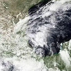 A tropical disturbance moved across the Caribbean sea between July 20 and July 24 before moving across the Yucatán peninsula.[40] After emerging into the south-central Gulf of Mexico, the disturbance organized into a tropical depression early on July 25. The depression moved west-northwest into northeast Mexico on July 26 before its surface circulation dissipated. Heavy rains fell across western Texas, Oklahoma, and Arkansas when the remains of this system interacted with a stationary front across the southern Plains between July 28 and July 30.[8]