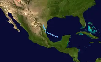 Tropical Depression Eight developed from a tropical disturbance over the Bay of Campeche on August 26. Moving northwestward, the cyclone failed to intensify into a tropical storm before making landfall in the Mexican state of Tamaulipas to the north of Tampico on August 28, with winds of 35 mph (56 km/h). After moving inland, the depression curved north-northwestward before degenerating into a surface low-pressure area near the Mexico–United States border on August 29. The remnants moved eastward across Texas and entered Louisiana before dissipating on September 1.[11]