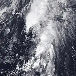 The thirteenth operationally classified tropical depression developed 275 mi (445 km) southwest of Bermuda on September 23,[52] and was initially expected to intensify into a tropical storm.[53] Although it failed to further intensify, Tropical Depression Thirteen brought squalls to Bermuda with winds gusts of tropical storm-force as it passed west of the island later that day. Moving northward, the system merged with a developing extratropical cyclone south of Nova Scotia on September 24.[18]