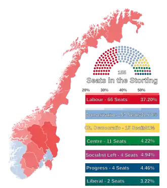 The Conservative Party made the strongest gains in the election. The Labour Party remained the largest party in the Storting, winning 66 of the 155 seats.