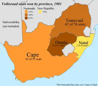 General elections were held in South Africa on 29 April 1981. The National Party, under the leadership of P. W. Botha since 1978, lost some support, but achieved another landslide victory, winning 131 of 165 directly elected seats in the House of Assembly.[1]