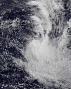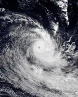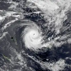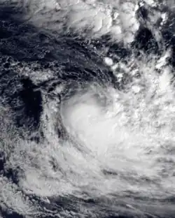 During March 27, the FMS started to monitor a depression that had developed, within a trough of low pressure about 235 km (145 mi) to the northeast of Penrhyn in the Northern Cook Islands.[23][24] Over the next couple of days, the system moved south-westwards and passed about 140 km (85 mi) to the southeast of Penhryn, as it gradually developed into a tropical cyclone.[23][24] The depression was subsequently named Tomasi by the FMS during March 29, after it had developed into a Category 1 tropical cyclone on the Australian scale.[23] After the system was named, Tomasi went through a period of rapid intensification, with an eye appearing on visible satellite imagery during that day.[23] It was also classified as a Category 3 severe tropical cyclone, before a tropical cyclone alert was issued by the FMS for Niue at around 23:08 UTC (11:08 FST, March 30).[23]
