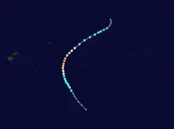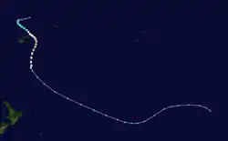 The system that was to become Tropical Cyclone Kina was first noted on November 6, while it was located just to the east of Tuvalu.[11][12] Over the next few days the system moved south-westwards and gradually developed further, before the JTWC reported that the system had developed into a tropical cyclone, with peak 1-minute sustained winds of 75 km/h (45 mph) during November 10.[12] During that day the FMS also reported that the system had developed into a Category 1 tropical cyclone on the Australian Scale and named it Kina.[11][12] The FMS subsequently estimated during the next day that the system had reached its peak intensity, with 10-minute sustained winds of 75 km/h (45 mph) during November 11.[11][12] Later that day the system's upper-level circulation became sheared off from its lower and moved southwards away from it.[11] The degenerating system subsequently passed to the west of Fiji during November 13, before it was last noted during November 16, as it passed over the island of Efate in Vanuatu but no damage was reported.[12][13] The system caused strong winds and rough seas on Viti Levu and in the Yasawas and Mamanutha group of islands.[11] Tourists on the Blue Lagoon Cruise in the Yasawas were forced to take shelter from Kina, while 18 people on another boat were temporarily listed as missing as they took shelter.[11]