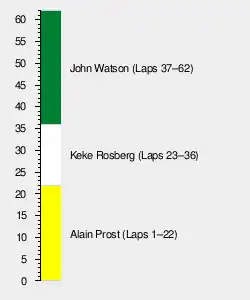 Secure in the lead, Watson was able to back off as Rosberg struggled with fuel feed problems and worn tires, in addition to his ailing gearbox, and dropped all the way back to fifth on the track and fourth on combined time. With an average speed of only 78 mph, the two-hour time limit was well short of the intended 76 laps, and Watson took his second win of the season, which was the first Detroit Grand Prix, at America's sixth different Formula One venue. American Eddie Cheever claimed second for his best Grand Prix finish, ahead of Pironi in third.
