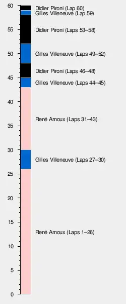 The Renaults of René Arnoux and Alain Prost qualified first and second, but their cars failed in the race, leaving Ferrari occupying the top two positions with Gilles Villeneuve leading Didier Pironi. The third-placed Tyrrell of Michele Alboreto was far behind, so Ferrari ordered their drivers to slow down to minimize the risk of mechanical failure or running out of fuel. Villeneuve believed this order also meant that the cars were to maintain position on the track, with Villeneuve ahead of Pironi. However, Pironi believed that the cars were free to race, and passed Villeneuve. Villeneuve believed that Pironi was simply trying to spice up an otherwise dull race, and duly re-passed his teammate, assuming that he would then hold station for the remainder of the race. Thus, Villeneuve failed to protect the inside line going into the Tosa corner on the final lap, and Pironi passed him to take the win. Villeneuve was irate at what he saw as Pironi's betrayal, although opinion inside the Ferrari team was split over the true meaning of the order to slow down. Villeneuve's expression was sullen on the podium, enraged by Pironi's actions. He was quoted afterwards as saying, "I'll never speak to Pironi again in my life." They proved to be prophetic words, as he was still not on speaking terms with his teammate when he died during qualifying for the Belgian Grand Prix two weeks later. Pironi's pass on Villeneuve is considered to be one of the most controversial moments in Formula One.[1][2]