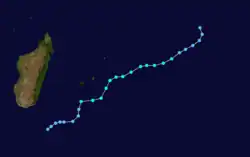 MFR began tracking a tropical disturbance in the Mozambique channel on January 4. The next day, the agency estimated the system intensified into a moderate tropical storm,[18] prompting the Madagascar Meteorological Service to name it Caboto.[1] The storm moved southward along Madagascar's western coast, reaching peak winds of about 65 km/h (40 mph).[18] Caboto made landfall on January 7 to the north of the mouth of the Mangoky River, and crossed the southern portion of the country, emerging near Farafangana into the Indian Ocean. Winds associated with the storm reached 43 km/h (27 mph) at Morondava on the west coast and 63 km/h (39 mph) at Farafangana on the east coast. A developing ridge caused Caboto to slow after it reached open waters, executing a partial loop southwest of Réunion before turning to the south and dissipating on January 10.[1]