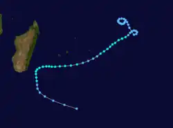 In addition to the 11 named storms, there were two additional storms in the season, classified by the Joint Typhoon Warning Center (JTWC).[nb 2] The first developed in July in the Australian basin, and briefly crossed into the south-west Indian Ocean on July 14. Soon after it re-entered the Australian basin and dissipated.[6] The other formed just southeast of Diego Garcia on November 20. It tracked to the southwest, and the JTWC estimated peak 1 minute sustained winds of 85 km/h (55 mph). The storm dissipated on November 25 northeast of Mauritius.[7] In addition, Cyclone Daryl, which formed in the Australian basin on March 6, crossed into the south-west Indian Ocean on March 16 as a weakening storm without being renamed. Two days later it re-entered the Australian basin before dissipating.[8]