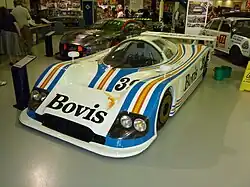It was apparent in the shorter endurance races that the primary opposition to Porsche's dominance would come from Lancia. After working the rules the previous year with their LC1, the company produced their Group C candidate. Designed by GianPaolo Dallara, it was built around the Ferrari 2.6-litre V8 used in its 308 GTB road-car. Fitted with twin KKK (Kühnle, Kopp & Kausch) turbos and a Weber-Marelli engine-management system, the engine could put out 650 bhp on 1.2-bar boost. The LC2 had a Kevlar and carbonfibre bodyshell designed by Pininfarina and was fast, but had proven fragile. Three cars were brought to Le Mans, once again built around their Grand Prix drivers: Michele Alboreto/Teo Fabi, Piercarlo Ghinzani/Hans Heyer (on loan from Joest) and Alessandro Nannini/Paolo Barilla/Jean-Claude Andruet.[19][13] In the early-season they had been shod with Pirelli tyres, but after proving troublesome they were swapped out for Dunlops.[20][11] The Sivama team had raced Group 5 Lancia Montecarlos in the Championship the previous year. This season they bought three of the Group 6 Lancia LC1 chassis and set about bringing them up to Group C spec with new bodies and the turbo-engine enlarged to 1522cc. With no great difference in weight, the small engine could only get them up to 280 kp/h (175 mph). One was written off in an accident at Silverstone, but the other two arrived at Le Mans, led by current F3 champion Oscar Larrauri.[21][22]