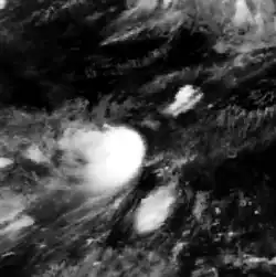 A large area of thunderstorm activity formed west of the Philippines. Rapidly organizing on September 28, Georgia became a tropical storm by the next morning. Moving westward, it tracked across Hainan Island to the south of China. Wind gusts reached 60 knots (110 km/h) both at Tate's Cairn and Kowloon Tsai Hill in Hong Kong.[1] Ultimately the storm made its final landfall in Hà Nam Ninh, Vietnam before dissipating while entering Laos. Georgia killed 26, damaged 7000 buildings, and led to a loss of 247,000 acres (1,000 km2) of rice. The 13 to 14 inches (330 to 360 mm) of rainfall it brought to Vietnam relieved drought conditions.[21]