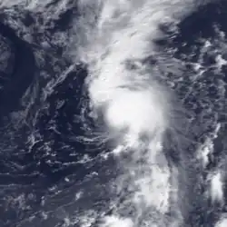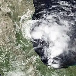 The origins of Tropical Storm Edouard are unclear, but an area of persistent organized storms formed in the Bay of Campeche, which strengthened into a tropical storm on September 14. Edouard rapidly intensified, with wind speeds reaching 65 miles per hour (105 km/h) in 18 hours as a faint eye feature became visible. Following its strengthening, Edouard dissipated even more quickly, degenerating into an area of thunderstorms the next day.[36] The remnants of Edouard moved over land near the port of Veracruz.[37]