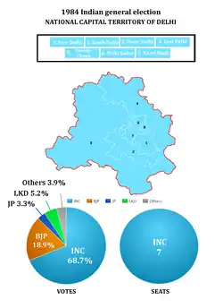 The Indian National Congress won all the seven seats of Delhi and won two-thirds of the votes.[1] This was the second of three times in which the Congress won all seven seats of Delhi, the first time being in the 1971 Indian general election.[2]