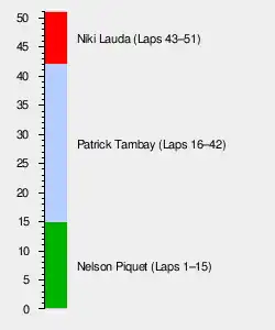 At the start, de Angelis passed Prost and Piquet, though the Brabham driver retook the lead into the first chicane. Tambay also made a fast start to run fourth, while Lauda fell to seventh behind Mansell and Fabi. While Piquet set about building a lead, Prost and Tambay overtook de Angelis, only for Prost's engine to fail on the fourth lap. In the meantime, Fabi and Lauda passed both Lotuses, and were thus up to third and fourth.