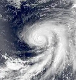 Meanwhile, Tropical Storm Ed was approaching from the northwest and the ridge north of Dinah moved east, which turned the typhoon northwest. For 48 hours between July 26 and July 28, Dinah and Ed were between 1,165 and 1,670 kilometres (724 and 1,038 mi) from one another, and fujiwhara interaction did impart a slight change onto Dinah's track. On July 27, while the cyclones were at their closest approach, Dinah weakened due to the more dominant outflow from Ed. The westerly shear led to a change in track to the east-northeast for Dinah. On July 28, once the cyclones moved farther apart, Dinah restrengthened rapidly and reached its maximum intensity by noon on July 29. Moving north-northeast around the western fringe of the subtropical ridge, Dinah's motion accelerated, moving close to Marcus Island late that afternoon, causing extensive vegetation damage. The coast guard station on the island sustained US$30,000 in damage (1984 dollars) when sustained winds reached 63 knots (117 km/h), with gusts to 89 knots (165 km/h). Weakening as it continued to move north-northeast, Dinah regained tropical storm status on July 31. Veering more northeast and interacting with a nearby upper trough in the Westerlies, Dinah became an extratropical cyclone late on August 1. The nontropical cyclone moved off the east, eventually crossing the International Date Line.[8]
