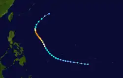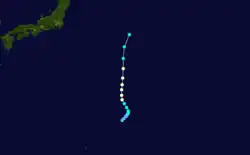 For two weeks after Betty and Cary, a high pressure dominated the northwest Pacific, with no sign of a monsoon trough. A cold front dropped into the area from the north, and remained stationary across much of the central North Pacific just north of Wake Island for nearly a week. An area of convection along the tail of the old frontal boundary formed on July 21, and closed off a wind circulation just northwest of Wake Island. Drifting westward, the system did not develop considerably until July 23. By late on July 24, it became a tropical depression. Intensifying while moving west-southwest, the system became a typhoon late on July 25 with a 55 kilometres (34 mi) wide eye.[8]