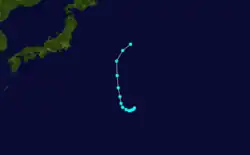 Initiated by the tropical tropospheric trough (TUTT), an area of convection was first noted southeast of the upper trough in an area with favorable upper level divergence on July 2 near 18N 168E. The disturbance moved west-southwest and evolved into a tropical depression late on July 6 and a tropical storm soon after. The cyclone moved northwest towards a break in the subtropical ridge and reached typhoon status late on July 9 forming a large eye about 55 kilometres (34 mi) in diameter. Rapid development continued for another 12 hours as it slowly moved through the ridge axis. The cyclone turned northeast late on July 10 as it began to be sheared significantly from the northwest. Shearing relented on July 11 allowing the eye to reform, this time 75 kilometres (47 mi) wide. As the typhoon progressed more poleward, increased vertical wind shear and the entrainment of cooler and drier air began its extratropical transition. By late on July 14, Cary had become an extratropical cyclone. The nontropical system then moved westward, eventually dissipating south of Japan.[7]