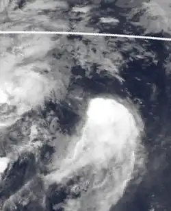JMA declared that a depression formed from a cold-core low on September 2. Moving eastwards, it crossed the International Date Line on the next day.[19] Just after crossing it strengthened into a tropical storm, thus receiving the name Moke from the Central Pacific Hurricane Center.