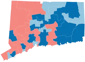 The Democrats, led by minority leader Cornelius O'Leary, flipped control of the State Senate. They managed to gain a two-thirds majority over the Republicans, achieving a supermajority. This was in large part attributed to the popularity of incumbent Democratic governor William O'Neill and his landslide re-election, having a coattail effect boosting down-ballot Connecticut Democrats due to the state's improved economy, with it also leading to them reclaiming the state house.[1][2][3]