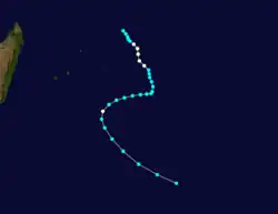 Several areas of convection persisted within the ITCZ in early March across the open Indian Ocean. One of these organized into a tropical storm on March 2 about 700 km (430 mi) south of Diego Garcia and was given the name Daodo.[21][22] On the following day, the JTWC began tracking it as Tropical Cyclone 21S.[2] Daodo moved slowly initially while quickly strengthening into a severe tropical storm. On March 4, a weak ridge steered the storm to the east, and the storm weakened slightly during this time. Three days later a stronger ridge to the east turned Daodo to the southwest, bringing it over its former path. On March 8, the JTWC upgraded the storm to the equivalent of a minimal hurricane. On the following day, the MFR upgraded Daodo to tropical cyclone status, estimating peak 10 minute winds of 135 km/h (85 mph), although it weakened back into a tropical storm on March 10. The storm accelerated to the southeast on the next day and maintained much of its intensity due to baroclinic interactions with a nearby anticyclone. On March 13, Daodo turned back to the southwest before moving more southward and later to the southeast. On March 18, the storm dissipated within a polar trough northwest of Île Amsterdam.[21][22]