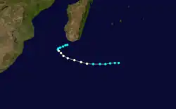 In addition to the storms classified by the MFR, the JTWC tracked four additional storms. The first, classified as Tropical Cyclone 01S, formed on August 1 in the northeastern portion of the basin,[2] an infrequent event for the time of year.[7] The storm moved westward with peak 1 minute winds of 85 km/h (55 mph). It gradually weakened, dissipating on August 3 near Diego Garcia.[8] The JTWC also tracked a short-lived storm in January that they classified as Tropical Cyclone 06S. The storm formed on January 7 in the eastern portion of the basin near Diego Garcia, and reached winds of 85 km/h (55 mph) while moving southeastward. After stalling on January 9, the system dissipated three days later.[2][9] Later, the agency monitored Tropical Cyclone 26S beginning on April 24. The storm formed south of Diego Garcia and moved in a counterclockwise direction, first to the southeast and later to the north. After reaching peak 1 minute winds of 85 km/h (55 mph), the storm dissipated on April 26.[2] The final storm tracked by the agency originated on June 25 in the far northeastern portion of the basin between Diego Garcia and the Cocos Islands. It moved slowly to the southwest, failing to intensify beyond winds of 65 km/h (40 mph). Turning to the southeast, the system dissipated on June 27.[2]