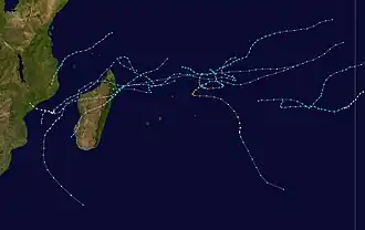 During the season, the Météo-France office (MFR) on Réunion island issued warnings in tropical cyclones within the basin. Using satellite imagery from National Oceanic and Atmospheric Administration, the agency estimated intensity through the Dvorak technique, and warned on tropical cyclones in the region from the coast of Africa to 90° E, south of the equator. The World Meteorological Organization recognized the MFR as a Regional Tropical Cyclone Advisory Centre in 1988, and would later label the agency as a Regional Specialized Meteorological Center in 1993.[1] The Joint Typhoon Warning Center (JTWC), which is a joint United States Navy – United States Air Force task force, also issued tropical cyclone warnings for the southwestern Indian Ocean.[2] The season's nine named storms is equal to the long term average, while the five tropical cyclones – a storm attaining maximum sustained winds of at least 120 km/h (75 mph) – was slightly below average.[3] The MFR considered the tropical cyclone year to begin on August 1 and continue to July 31 of the following year.[1]
