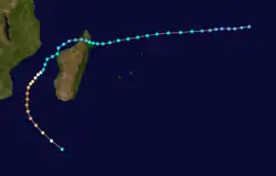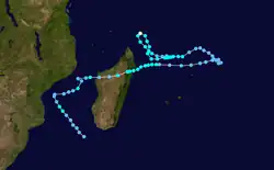 On January 22, a tropical disturbance formed to the southeast of Diego Garcia.[13] It moved generally to the west-southwest, intensifying into a tropical storm on January 23. That day, the Mauritius Meteorological Services named the storm Doaza,[14] and the JTWC classified it as Tropical Cyclone 09S.[2] On January 25, Doaza passed north of Tromelin Island,[14] and around that time it attained an initial peak of 80 km/h (50 mph).[13] Later that day, the storm struck eastern Madagascar near Île Sainte-Marie, and it quickly weakened over land,[14] so much so that the JTWC discontinued advisories.[2] However, Doaza emerged into the Mozambique Channel on January 26 near Mahajanga and soon after reorganized while curving to the south.[14] The JTWC again issued advisories on January 28,[2] around which time Doaza passed just southeast of Juan de Nova Island. On the next day, the storm attained tropical cyclone status, reaching winds of 135 km/h (84 mph) just west of Europa Island. On January 30, the JTWC estimated peak 1 minute winds of 215 km/h (134 mph), by which time the storm was moving due southward.[13] Doaza turned to the southeast and quickly weakened, dissipating within the westerlies on February 1.[14]