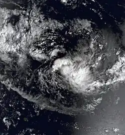 Two circulations became evident in the central Indian Ocean in the middle of March, the westernmost which would become Tropical Storm Hely. The eastern one would become Tropical Cyclone Gasitao, which was first originating on March 12 to the east of Diego Garcia. On March 15, it developed into a tropical storm about 700 km (430 mi) to the south-southeast of Diego Garcia while moving on a west-southwest trajectory.[23][24] On March 16, the Mauritius Meteorological Services named it Gasitao,[23] the same day that the JTWC classified it as Tropical Cyclone 16S.[2] By that time, the storm was moving more to the west as it gradually intensified.[24]