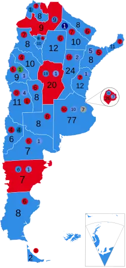 | Tierra del Fuego | 10,989 | 39.51 | 1 | 8,444 | 30.36 | 1 | 2,023 | 7.27 | — | 318 | 1.14 | — | 6,039 | 21.72 | — |