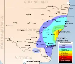 The effects were felt over an area of around 200,000 square kilometres (77,000 sq mi) in the state of New South Wales, with isolated reports of movement in areas up to 800 kilometres (500 mi) from Newcastle.[2] Damage to buildings and facilities was reported over an area of 9,000 km2 (3,500 sq mi).