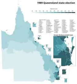 - ^ Australian Government and Politics Database. "Parliament of Queensland, Assembly election, 2 December 1989". Archived from the original on 18 January 2015. Retrieved 22 February 2009.
