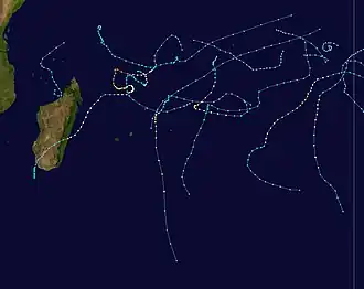 During the season, the Météo-France office (MFR) on Réunion island issued warnings in tropical cyclones within the basin. Using satellite imagery from National Oceanic and Atmospheric Administration, the agency estimated intensity through the Dvorak technique, and warned on tropical cyclones in the region from the coast of Africa to 90° E, south of the equator.[1] The Joint Typhoon Warning Center (JTWC), which is a joint United States Navy – United States Air Force task force, also issued tropical cyclone warnings for the southwestern Indian Ocean.[2] The season's nine named storms and five tropical cyclones – a storm attaining maximum sustained winds of at least 120 km/h (75 mph) – is the same as the long term average for the basin.[3]