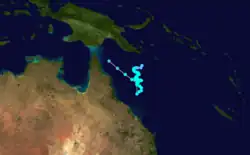 During March, 3 significant tropical lows including 15 and 16P were observed within the Coral Sea/Australian region, which did not become tropical cyclones on the Australian scale but were subject to gale warnings.[12] 15P was first noted on 3 March, while it was located about 900 km (560 mi) to the east of the Solomon Islands.[13] Over the next couple of days the system moved towards the south-west, before it moved into the Australian region during 5 March.[13] The system was subsequently designated as Tropical Cyclone 15P by the JTWC who issued two advisories on it, before it was last noted during the next day while it was located about 500 km (310 mi) to the northeast of Mackay, Australia.[3][13] 16P was first noted within the Australian region on 14 March, while located about 300 km (185 mi) to the southeast of Honiara in the Solomon Islands.[14] Over the next couple of days the system moved towards the south-east before the JTWC designated the system 16P, and initiated advisories on it during 18 March after it had moved into the South Pacific basin.[3] Over the next couple of days the system moved towards the south-southeast before it turned towards the southwest and passed over New Caledonia on 20 March, before it was last noted during the next day as it moved back into the Australian region.[14]