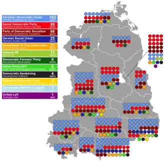 The contest was swept by the Alliance for Germany, a coalition led by the newly reconstituted East German Christian Democratic Union (CDU), which captured 192 of the 400 seats in the Volkskammer and had ran on a promise of swift reunification with West Germany. The Social Democratic Party (SPD), re-established only months earlier after its forced 1946 merger with the Communist Party of Germany (KPD), was widely tipped to win but instead came second with 88 seats. In third was the former ruling SED, now rebranded as the Party of Democratic Socialism (PDS), which secured 66 seats. The Alliance fell just short of an outright majority having needed 201 seats to govern alone.[1]