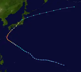 The 1990 Pacific typhoon season was another active season, with 31 storms being named during the year. It had no official bounds; it ran year-round in 1990, but most tropical cyclones formed in the northwestern Pacific Ocean between May and November.[1] These dates conventionally delimit the period of each year when most tropical cyclones form in the northwestern Pacific Ocean.