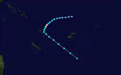 On November 13, the FMS started to monitor a tropical depression that had developed within the South Pacific Convergence Zone, to the northeast of the Solomon Islands.[4][8] Over the next few days, the system gradually developed further within an area of light winds in the upper troposphere, before the JTWC initiated advisories and designated it as Tropical Cyclone 03P early on November 15.[9][10] During that day the system's upper-level outflow characteristics became more favourable for further development, before the FMS named the system Tia early the next day after it had developed into a Category 1 tropical cyclone.[4] Later that day because of a developing northerly steering current, the system slowed down and undertook a small anticlockwise loop before starting to move towards the southwest and rapidly intensify. After rapidly intensifying throughout November 16 and 17, Tia passed within 55 km (35 mi) of Anuta Island at around 1800 UTC on November 17, before passing near Tikopia Island six hours later. As Tia moved near Tikopia, the FMS reported that the system had reached its peak intensity as a category 3 severe tropical cyclone with 10-minute sustained windspeeds of 140 km/h (85 mph).[4] During November 18, Tia started to gradually weaken under the influence of cooler sea surface temperatures and strengthening vertical windshear, while it moved southwards under the influence of a strengthening upper level northerly wind flow.[1][8] Over the next 24 hours, the system continued to move southwards and passed within 150 km (95 mi) of Vanuatu's Banks Islands, while gradually weakening further.[4] Tia subsequently degenerated into a tropical depression during November 20, before it was last noted during the next day, as it crossed a part of its former track where it had been producing hurricane-force windspeeds a few days earlier.[4][10]