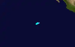 Part of the same tropical wave that formed Tropical Storm Danny in the Atlantic crossed over the Isthmus of Panama and became a disturbance in the Intertropical Convergence Zone during mid to late September. On September 20 the cloud pattern had increased in organization and the system was designated a tropical depression.[34] Continuing to strengthen, the depression became a tropical storm on September 21. The tropical storm then headed towards the northwest. Development was rapid, especially after September 22 as a banding type eye was forming. Further rapid development took place by the following day and the maximum sustained winds increased to its peak of 130 mph (215 km/h) by the afternoon of September 23. Jimena maintained itself as a powerful hurricane for three days, moving west until September 26, when it turned toward the west-northwest. Jimena began to weaken on September 27. A northwestward movement commenced on September 29 in response to a large upper-level trough which developed in its northwest. It continued to weaken and on September 30 it regained tropical storm intensity before becoming downgraded to a depression. On October 2, Jimena dissipated as a tropical cyclone.[34] Hurricane Jimena caused no reported damage or casualties.[35]
