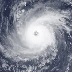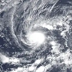 A tropical wave became better organized and it developed into Tropical Depression Seven-E while 976 miles (1570 km) south-southeast of Cabo San Lucas on July 29. The depression intensified quickly and became Tropical Storm Fefa the same day. Fefa continued to strengthen over the warm Pacific water and reached hurricane status on July 31. Satellite imagery showed the appearance of an eye on August 1. Fefa peaked on August 2 with a central pressure of 959 mbar (28.3 inHg) and winds of 120 mph (195 km/h), making it a Category 3 hurricane in the Saffir-Simpson Hurricane Scale.[21] Fefa crossed into the north central Pacific basin on August 5.[22] As it crossed, wind shear increased and Fefa began to weaken as it approached the Hawaiian Islands as a tropical storm on August 7. Fefa passed over the Big Island and rapidly weakened back to a tropical depression later that day. It finally dissipated on August 9 when northwest Kauai.[19]