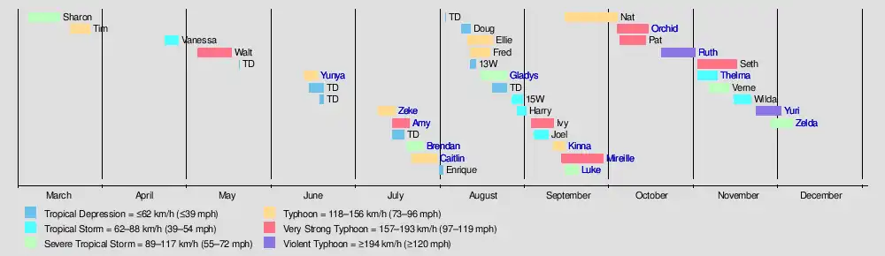 | Yuri | November 22 – December 1 | Violent typhoon | 220 km/h (140 mph) | 895 hPa (26.43 inHg) | Marshall Islands, Caroline Islands, Mariana Islands | $36 million | None | |