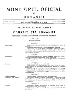- 8 December – Is adopted, through a national referendum, the new Constitution of Romania, approved by the Constituent Assembly on 21 November 1991; development, discussion and adoption of the Constitution lasted a year and a half.[6]